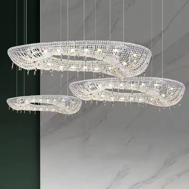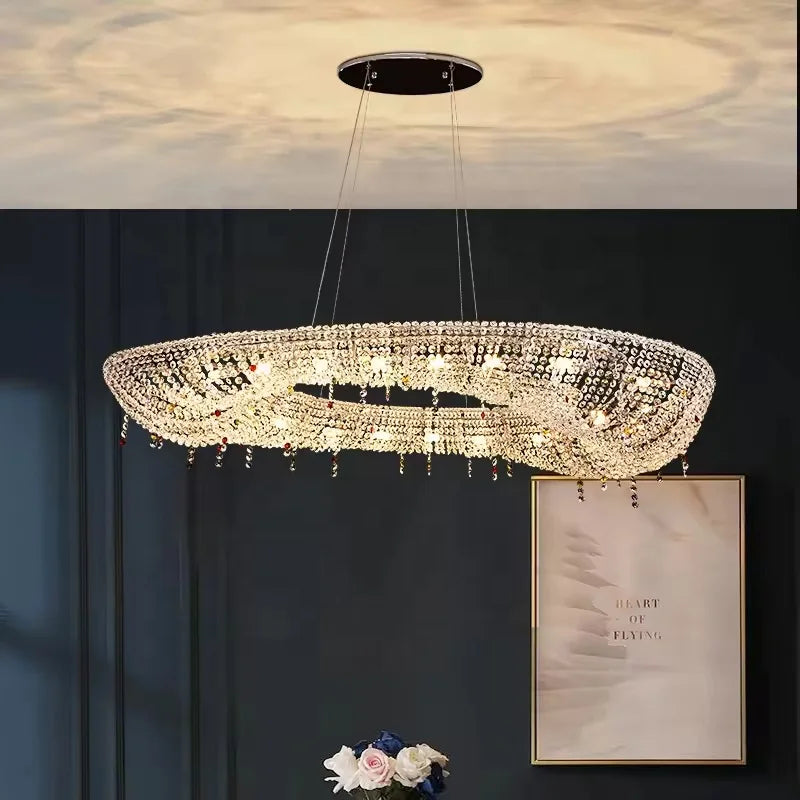 Elevate your interiors with the Vivara Chandelier. Designed with a sleek silver-finished frame and adorned with K9 quartz crystals, this pendant captures and reflects light in dazzling patterns, filling your space with warmth and brilliance. The oval halo silhouette creates a sense of infinite elegance—perfect for grand entryways, dining rooms, or as a show-stopping centerpiece above a wedding or event setting. Each crystal is precision-cut to maximize sparkle, while the polished frame adds a touch of contemporary refinement.